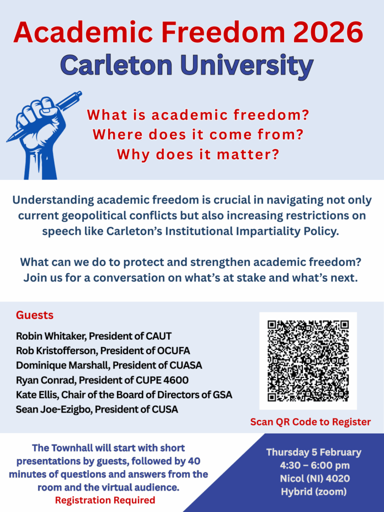 A hybrid townhall hosted by associations of professors & librarians, contract instructors, teaching and research assistants, graduate & undergraduate students, and more.  The event will start with short presentations by association representatives followed by an opportunity for the audience to ask questions. Where does Academic Freedom come from? What is it? Why does it matter? How ... Read more