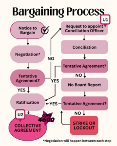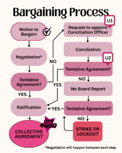 If after meeting(s) with the Ministry-appointed conciliator either party determines that bargaining has reached an impasse, they communicate that position to the Ministry of Labour, who then issues a formal “no-board” report. This report triggers a 17-day countdown to a “strike deadline,” after which time the Union can legally strike or the Employer can legally lockout employees. While it doesn’t happen every round, the filing of a “no-board” report at some point during negotiations between Carleton and CUPE 4600 is unfortunately a pretty regular occurrence. The “no-board” report is the third and always the final key procedural hurdle that a Union must clear in order to be in a legal strike position (the other two are a successful strike vote and filing for conciliation).